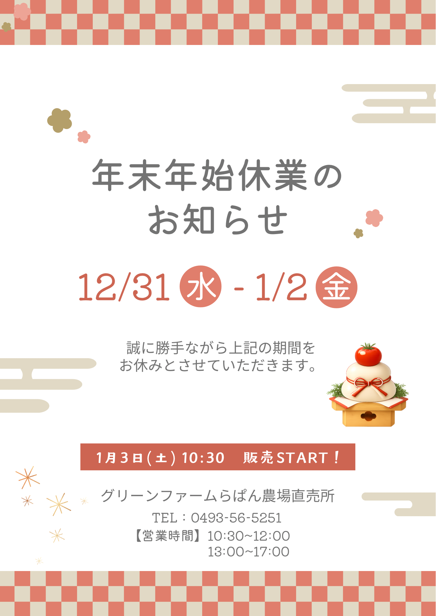 年末年始の直売所の営業についてお知らせいたします。